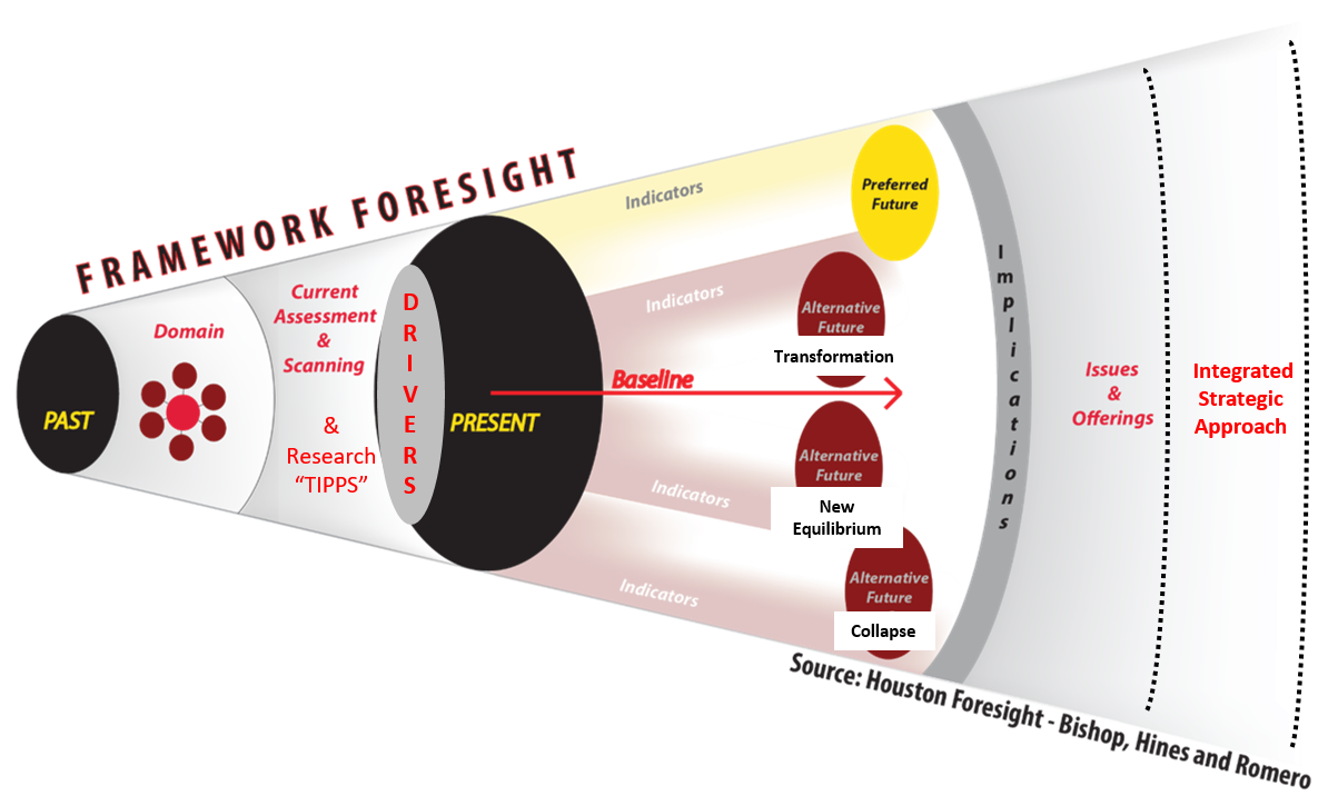 Even if there is no scientific way to predict the future, there are rigourous and systematic methods to understand and assess the plausibility of different courses of events. Scenario planning such as the Shell method is a well-known approach to envision different plausible futures. At Hotelschool The Hague, we also follow the Framework Foresight method (‘Exploring futures the Houston way’) in which common assumptions about the future are challenges to propose alternative directions for future developments.