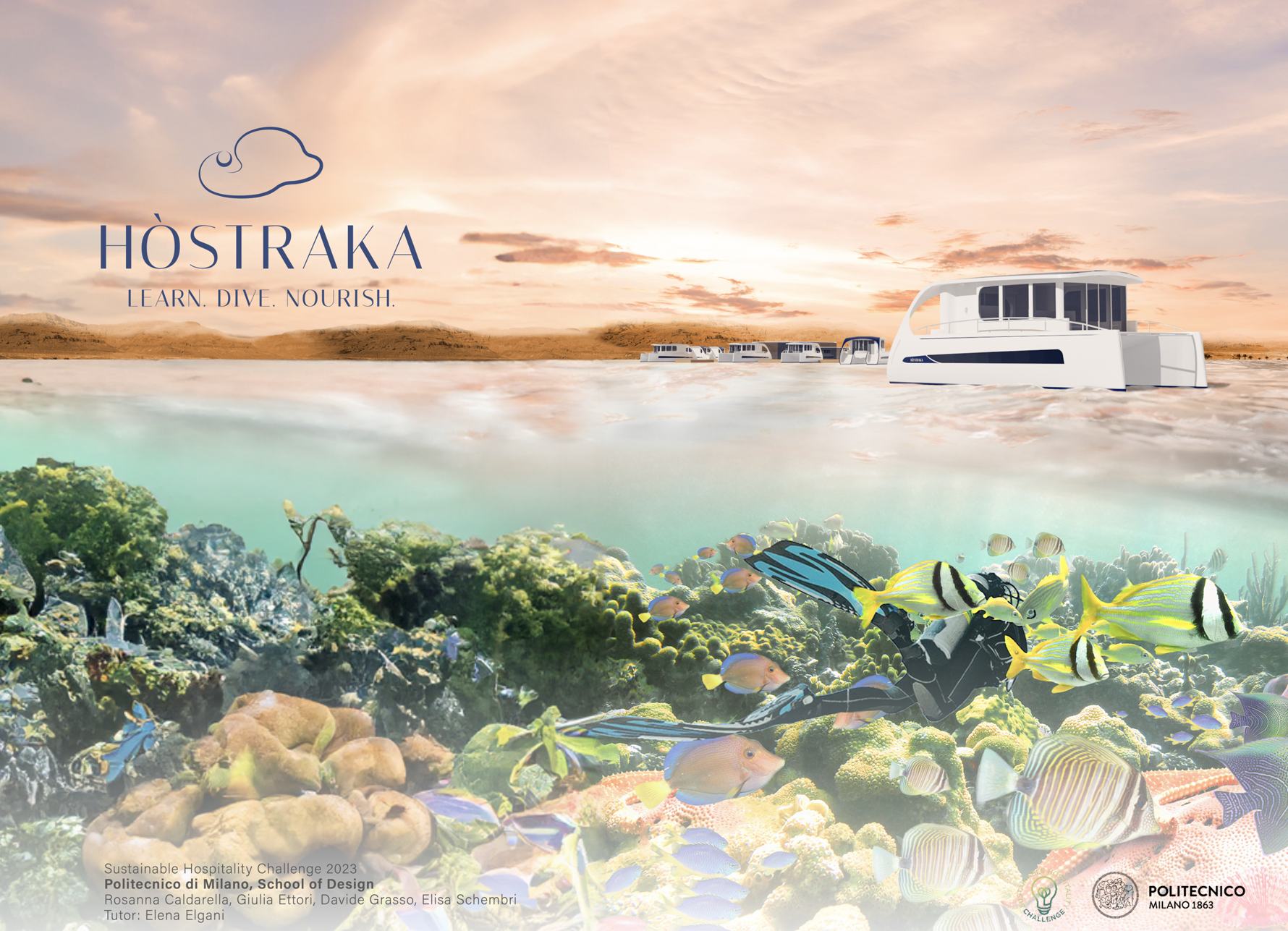 In their debut appearance at the 2023 Sustainable Hospitality Challenge, the dynamic team from Politecnico di Milano—comprising of Giulia Ettori, Rosanna Caldarella, Davide Grasso, and Elisa Schembri— emerged as the undisputed champions. Notably, they were the sole fully design-focused team in the finals, making their victory all the more remarkable. Their groundbreaking concept 'HÒSTRAKA' stole the spotlight, representing a visionary leap in sustainable innovation within the hospitality industry.