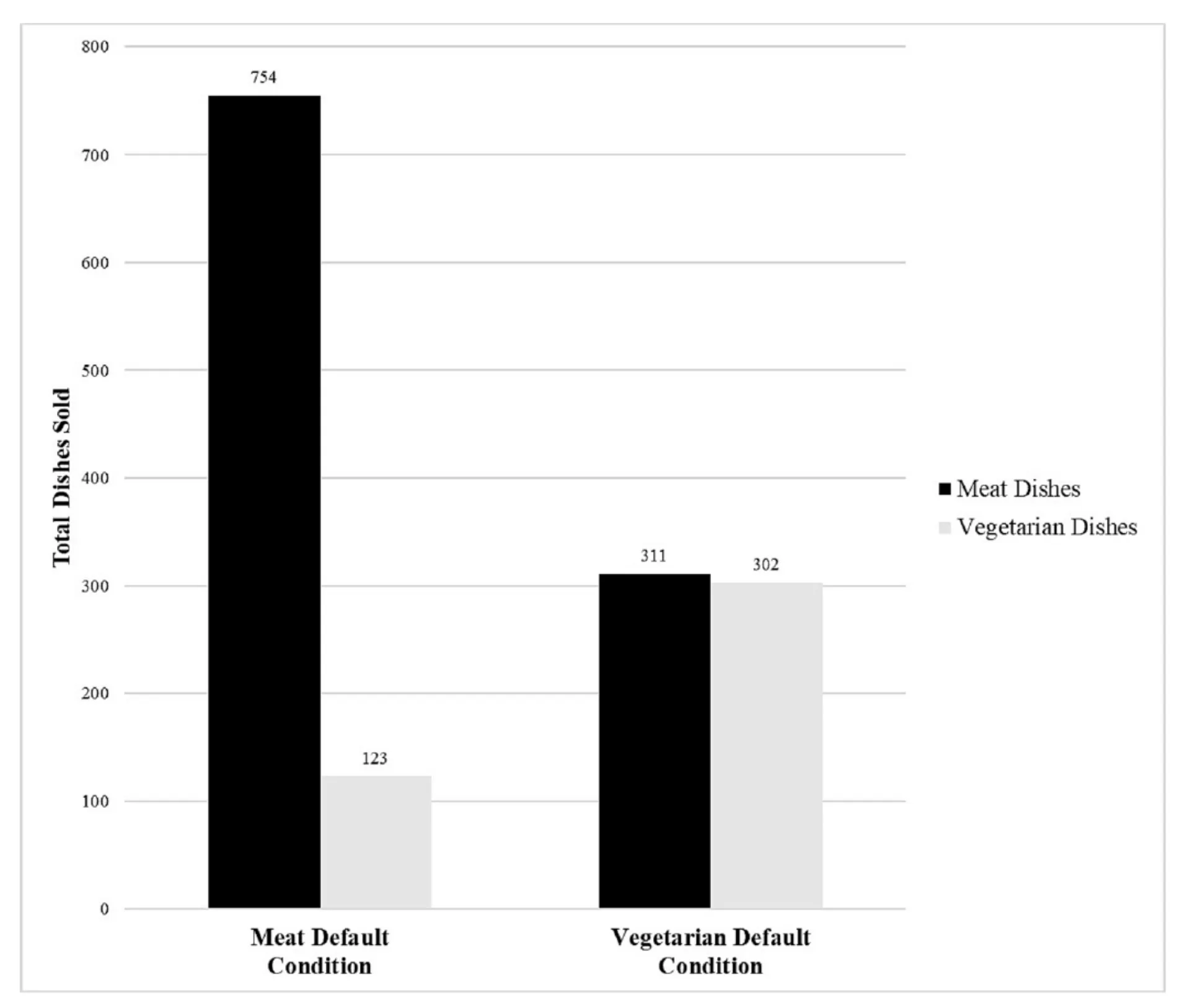 - Doubling of Vegetarian Option Sales: Setting a vegetarian option as the default led to a more than doubling of its sales compared to when meat was the standard. Specifically, 49.3% of customers chose vegetarian when it was the default, versus only 14.03% when they had to actively ask for it (Figure 1).